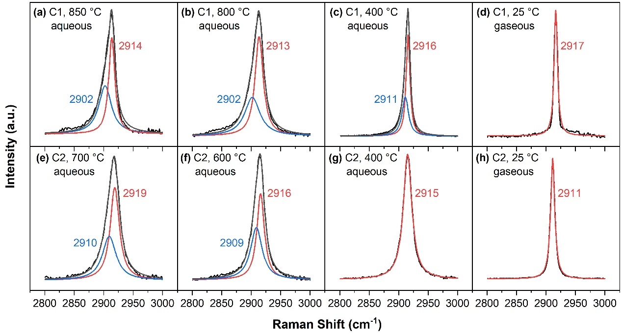 圖 3 2800-3000?cm-1波長(zhǎng)區(qū)域內(nèi)從高溫到低溫還原的含CH4的含水流體和氣相的拉曼光譜擬合結(jié)果。在C1實(shí)驗(yàn)中,鋯石被用作壓標(biāo)。800和850 ℃的拉曼光譜是在加熱過(guò)程中收集的,而400和25 ℃的光譜則是在達(dá)到最高溫度后冷卻過(guò)程中獲得的。在C2實(shí)驗(yàn)中,沒(méi)有使用壓標(biāo),以消除潛在的硅酸鹽干擾。600和700 ℃的拉曼光譜是在加熱過(guò)程中采集的,而400和25 ℃的拉曼光譜是在達(dá)到最高溫度后冷卻過(guò)程中采集的。請(qǐng)注意,紅色曲線表示擬合的CH4主峰,藍(lán)色曲線表示擬合的肩峰。